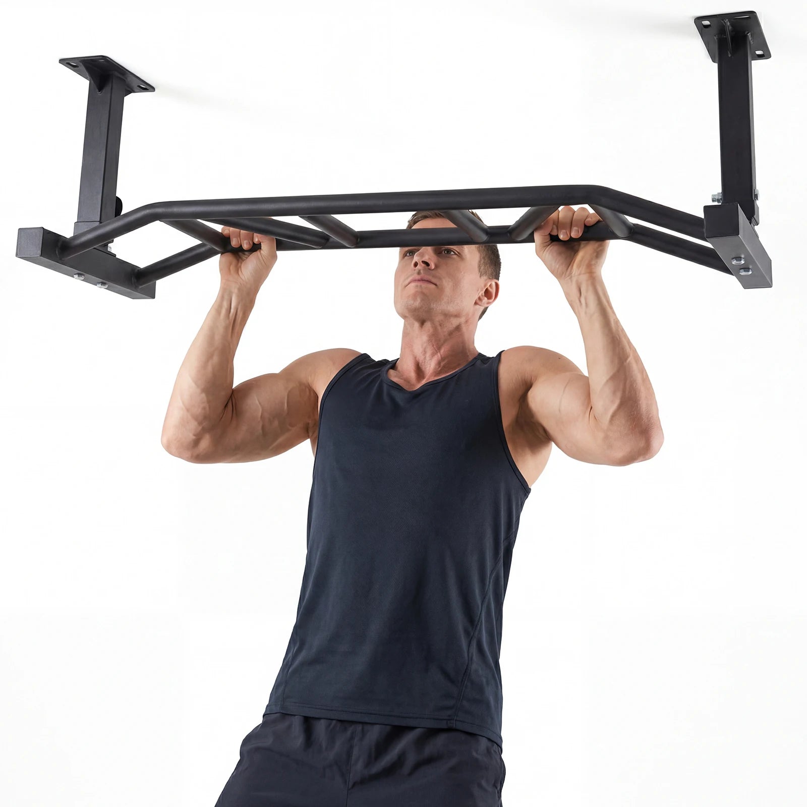 Elevate your home workouts with a ceiling-mounted pull-up bar that adjusts to your height and grows with your strength across multi-grip options.